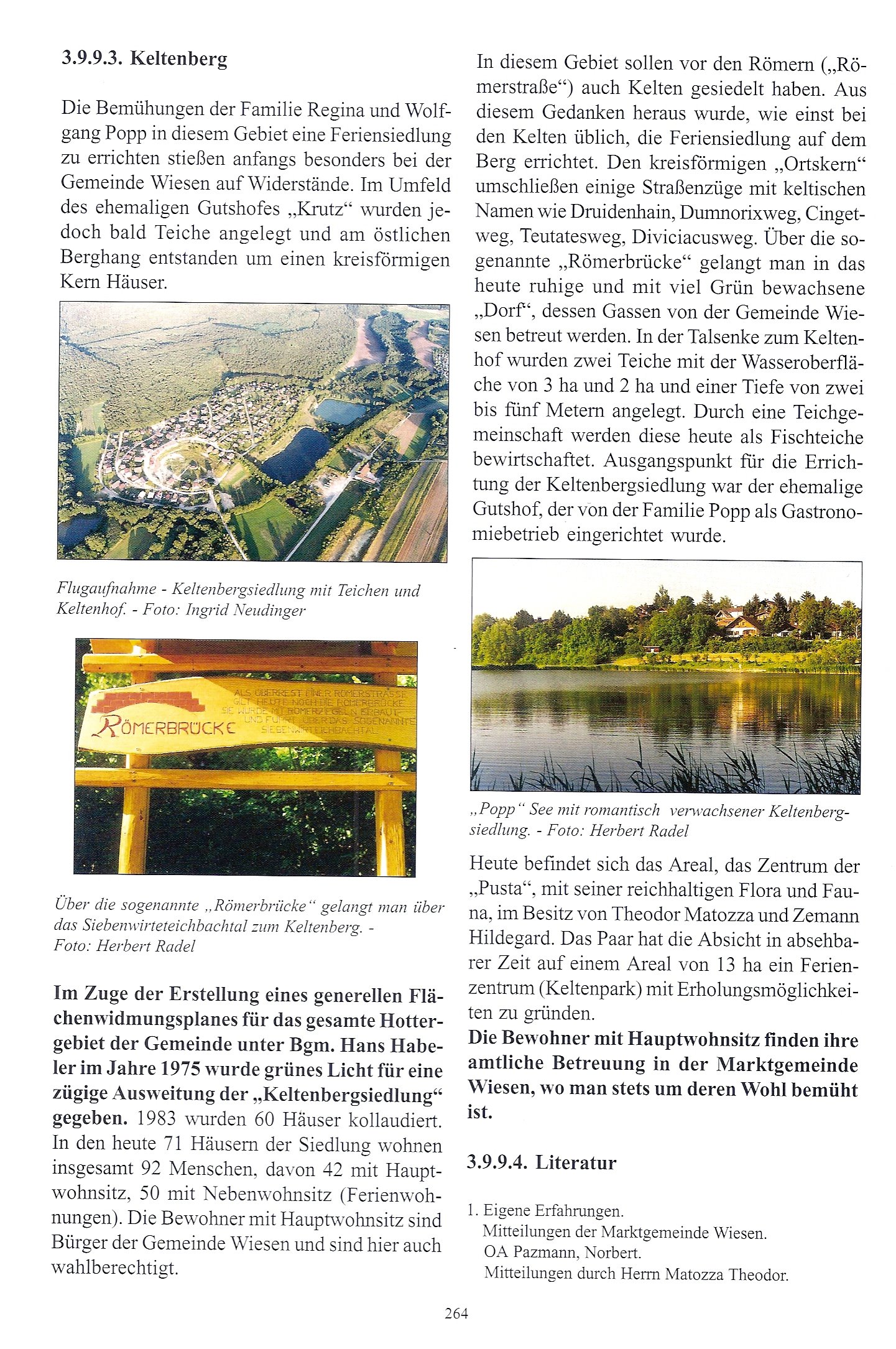 Anfang der 1970er Jahre begann die Aufschließung des Keltenberges durch Herrn Wolfgang Popp mit der Idee, eine Feriensiedlung zu gründen. Als zusätzlicher Anreiz wurden zwei Teiche angelegt, die als Fischteiche genehmigt wurden. Zuerst wurde der Wiesener Teil des Keltenberges parzelliert, der erste Kaufvertrag am 15.11.1975 unterschrieben.